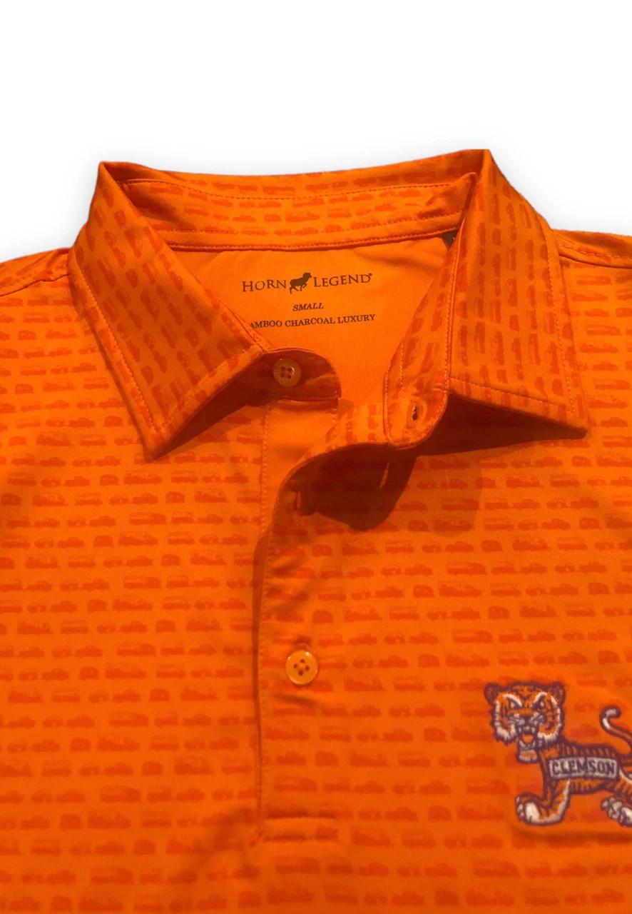 Look stylish at any Tiger’s event with the perfect Clemson polo! This Orange Horn Legend Polo features a cocktail printed design in school colors with an embroidered Retro Clemson Walking Tiger logo on the left chest.